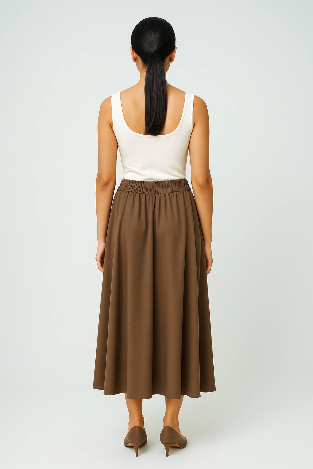 This versatile midi skirt brings effortless elegance to your wardrobe with its flowing silhouette and flattering fit. Designed to sit comfortably at the waist, it drapes beautifully into a soft A-line shape, making it a timeless piece for both casual and dressy occasions. The elasticated back waistband ensures ease of wear while maintaining a sleek front appearance. With an approximate length of 90 cm, it pairs perfectly with a variety of tops and shoes, offering endless styling possibilities.