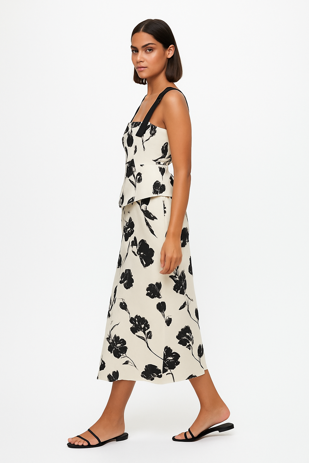 Add timeless elegance to your wardrobe with this A-line midi skirt, adorned with a striking black floral print on a soft ivory base. The flattering silhouette flows gracefully, while the smooth waistband ensures a comfortable and polished fit. With a skirt length of approximately 93 cm (Size S), it offers the perfect balance between sophistication and ease, making it suitable for both daytime chic and evening charm. Pair effortlessly with top 2505021 for a coordinated, statement-making look.