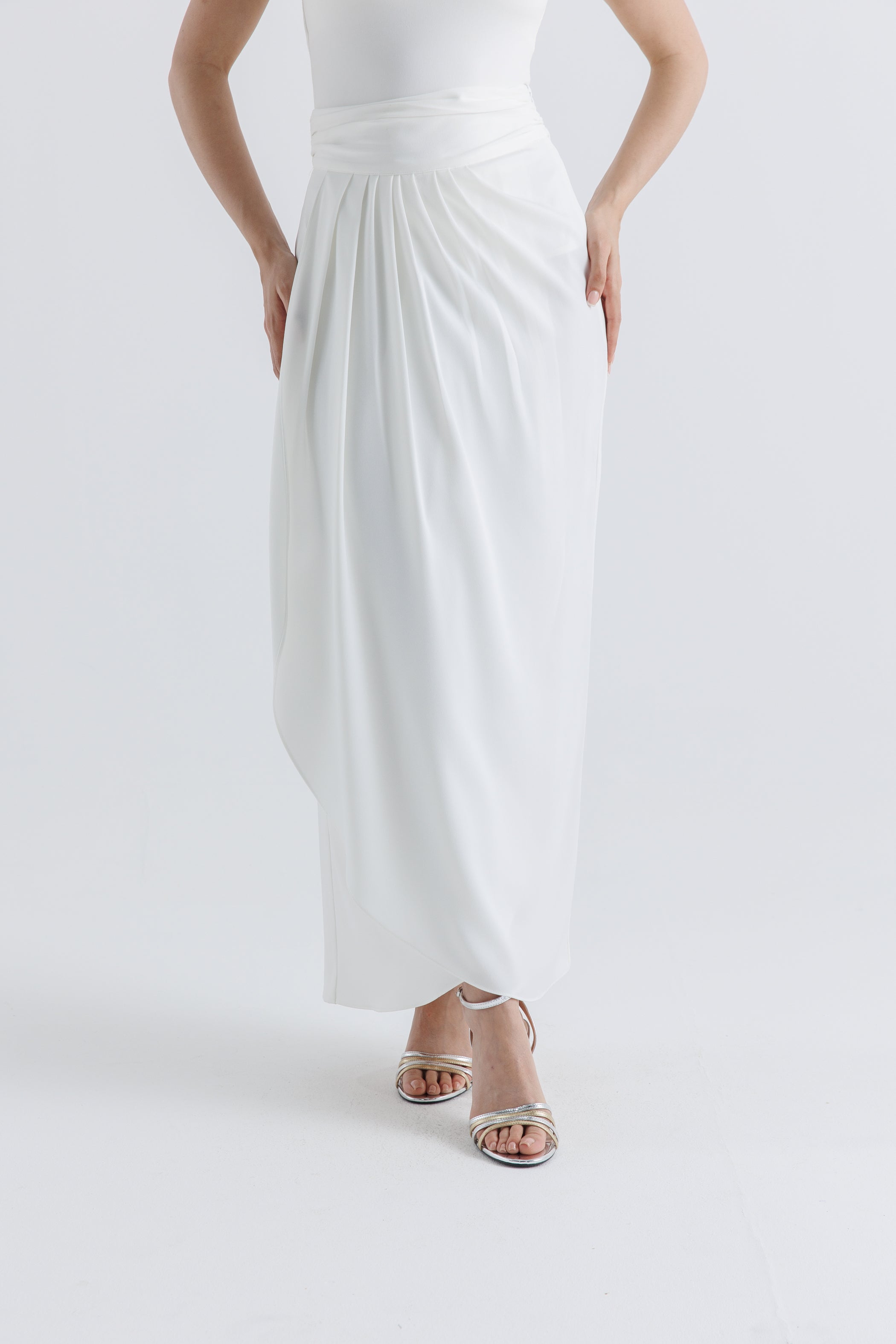 This draped tulip-cut skirt is the epitome of refined minimalism. Crafted from soft, fluid fabric, it features elegant front pleats and a high waistband that defines the silhouette with subtle structure. The asymmetrical hem adds graceful movement and a modern twist, making it perfect for pairing with fitted tops or dressy blouses for both day and evening looks.