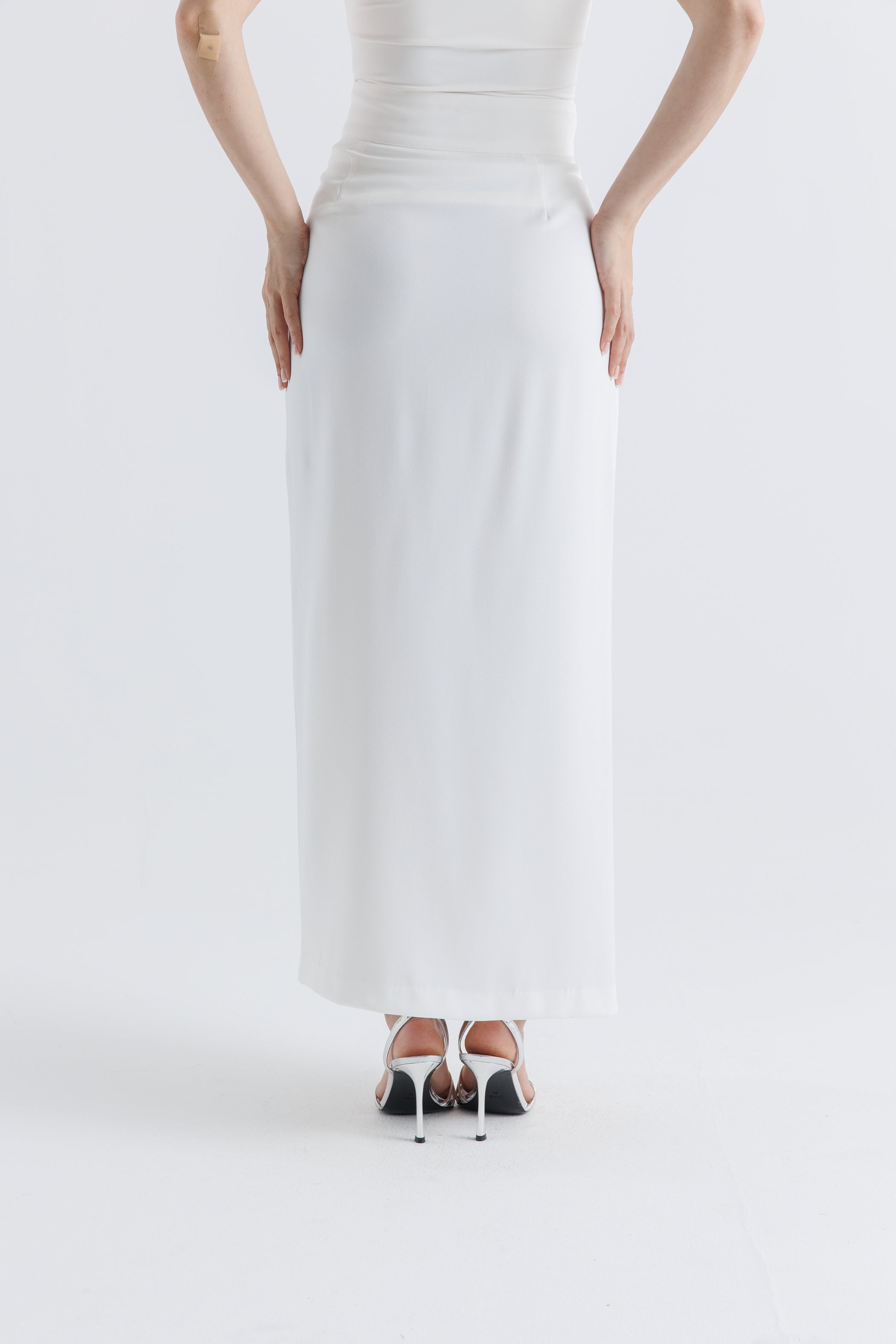 • Design: High-waisted skirt with front pleats and a tulip-style overlapping hem