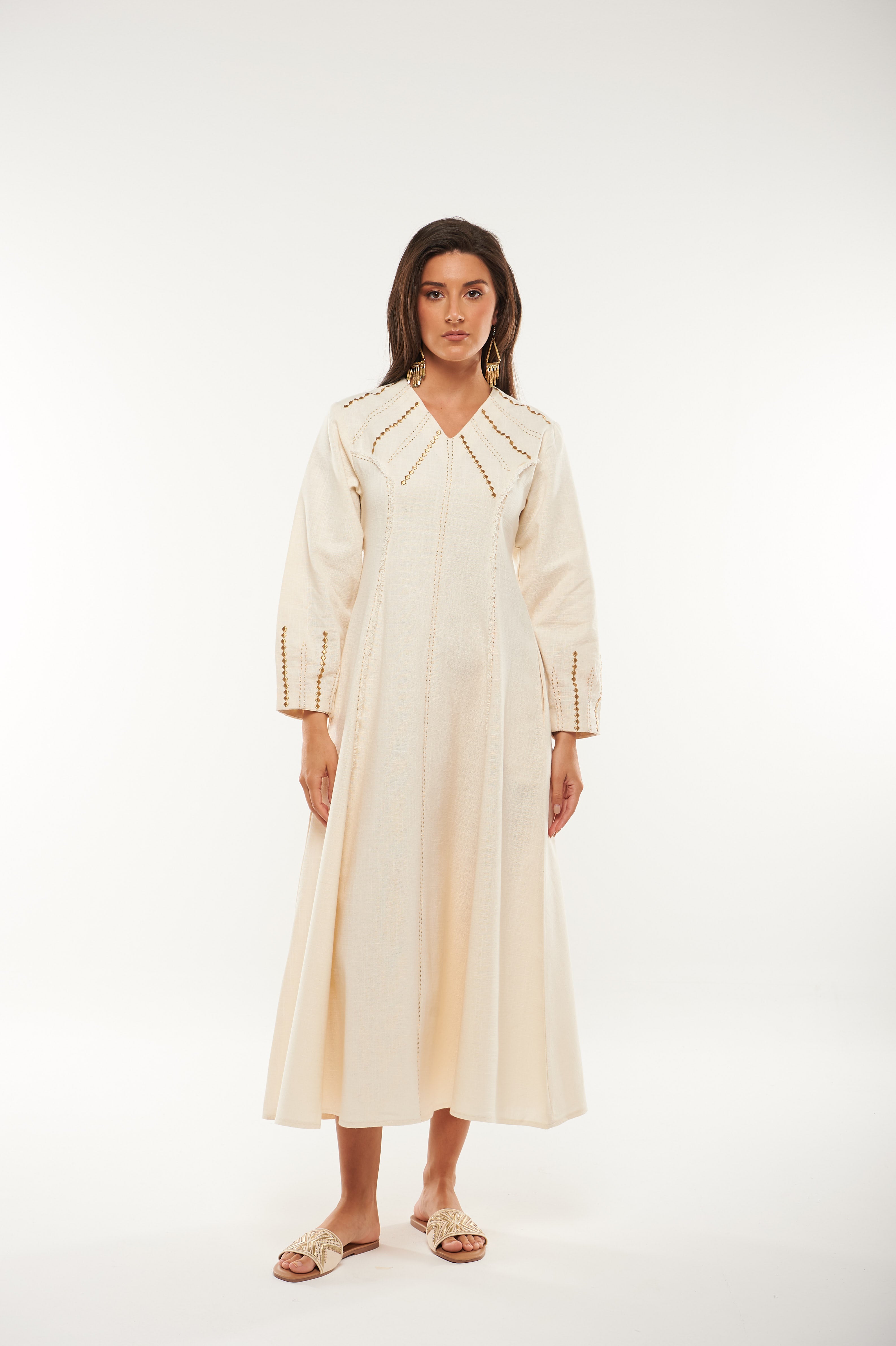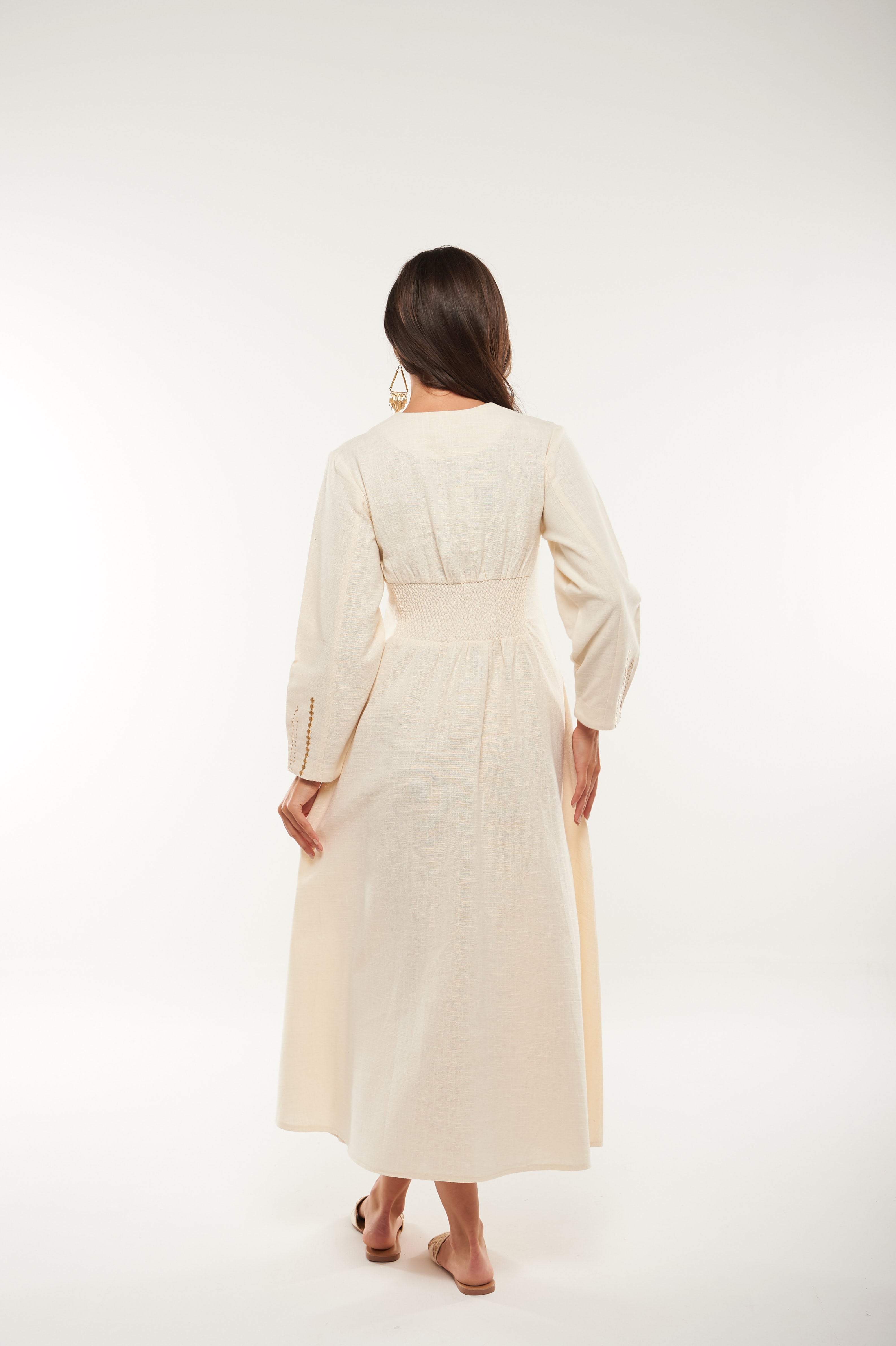 Elevate your everyday elegance with this beautifully tailored linen maxi dress. Crafted from a breathable textured linen-blend fabric, this dress features a flattering V-neckline, full-length sleeves, and intricate metallic embroidery across the chest, sleeves, and front seams. The front panel includes soft raw-edge detailing for a touch of artisanal charm, while the back is smocked at the waist for added comfort and shape. Side pockets offer practical functionality without compromising on style.
