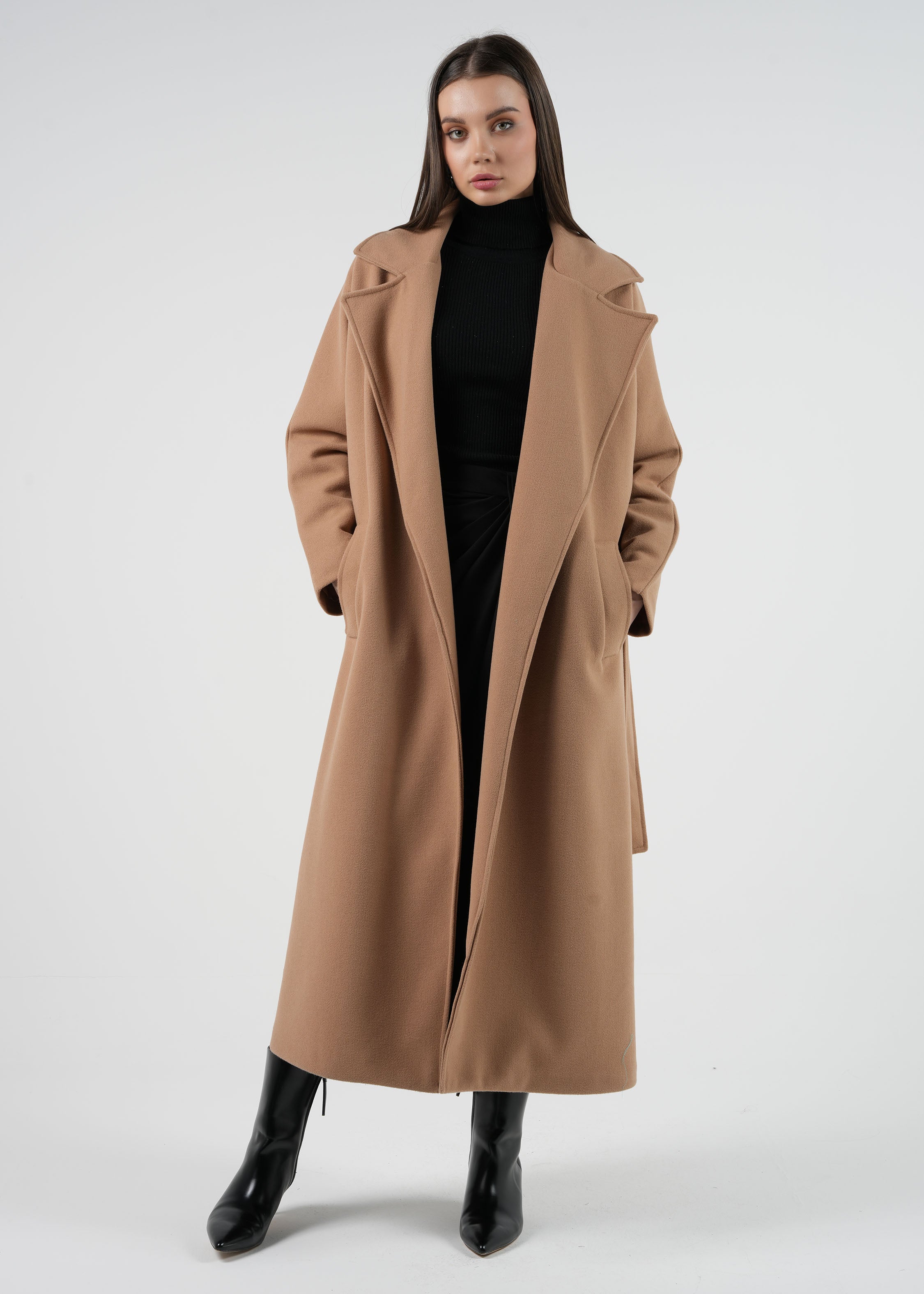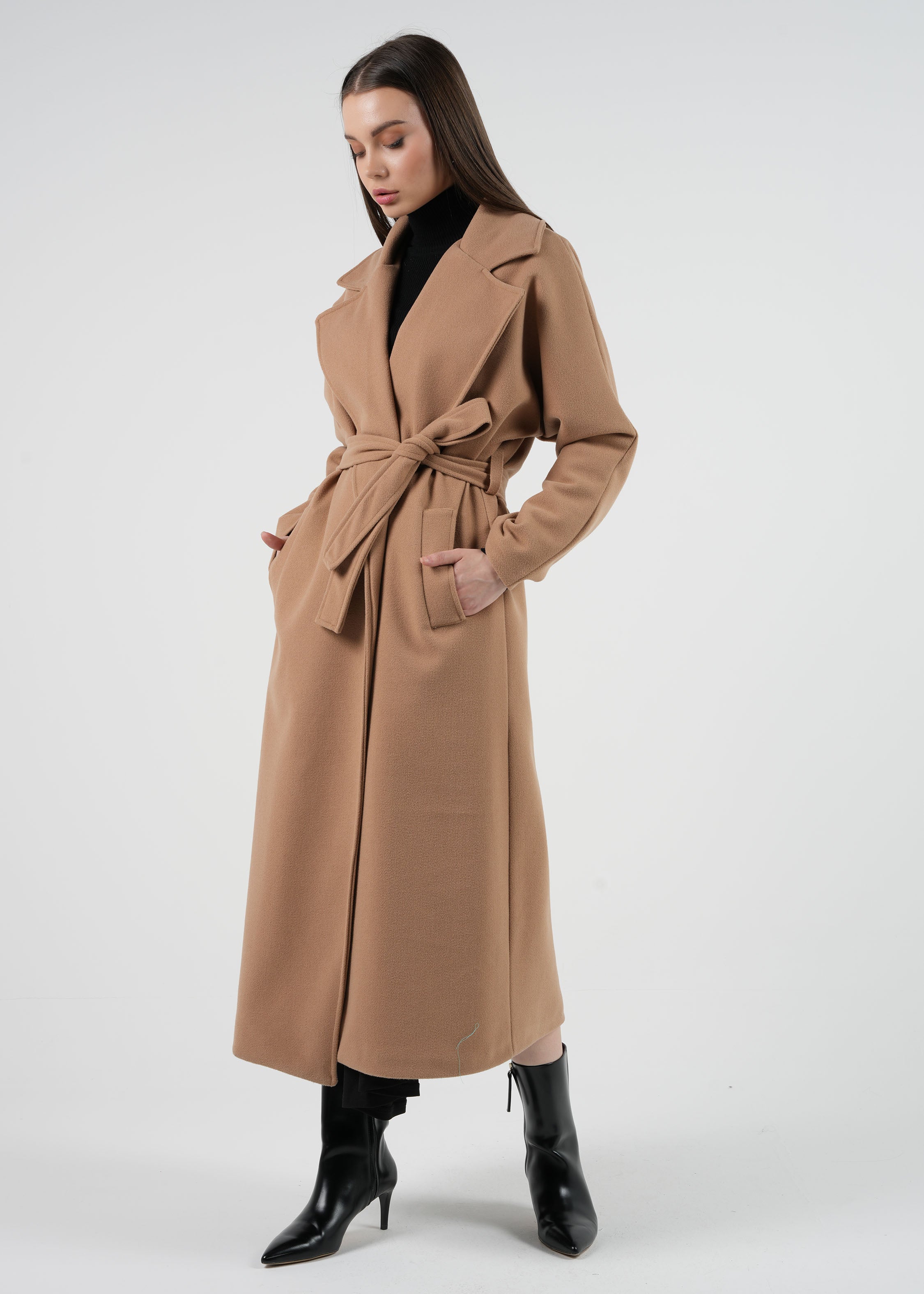 Upgrade your winter wardrobe with this elegant belted wool coat. Featuring a sophisticated lapel collar and a self-tie belt, this coat offers a flattering silhouette that complements any outfit. The soft, warm wool blend ensures comfort and insulation, making it a perfect choice for chilly days.