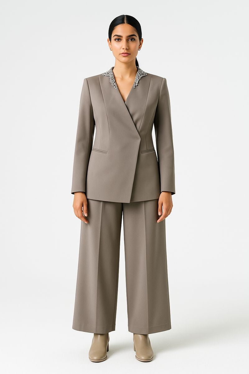 Style the Amara Elegant Wide-Leg Tailored Pant with Jacket 2575014 for a coordinated and sophisticated Ramadan and Eid ensemble. Complete the look with a fitted top, classic heels, or ankle boots, adjusting the side zip for a sharper or more relaxed silhouette.
